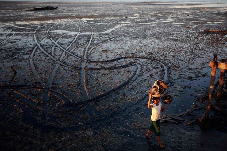 Девушка идет по грязному пляжу после пожара в Kyaukphyu, Мьянма, 5 ноября 2012 года.