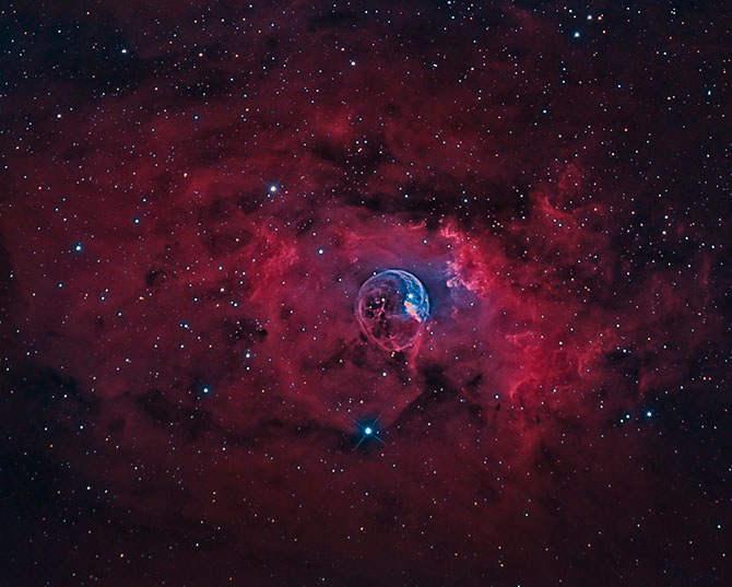 Это эмиссионная туманность в созвездии Кассиопея. Пузырь имеет диаметр 10 световых лет, и в нем происходят довольно бурные космические образования. Выше и правее центра пузыря находится яркая, горячая звезда, в 45 раз массивнее и в несколько сотен тысяч раз ярче нашего Солнца.