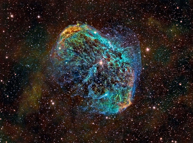 NGC 6888, также известная как Туманность Полумесяц — это большой космический пузырь около 25 световых лет в поперечнике, продуваемый ветрами от яркой массивной звезды, находящейся в центре. Каждые 10 000 лет с поверхности звезды выбрасывается в пространство вещество, эквивалентное по массе нашему Солнцу. Из-за столь стремительного сжигания «топлива» звезда находится на последней стадии свой жизни. Потом она погибнет в красочном взрыве сверхновой.