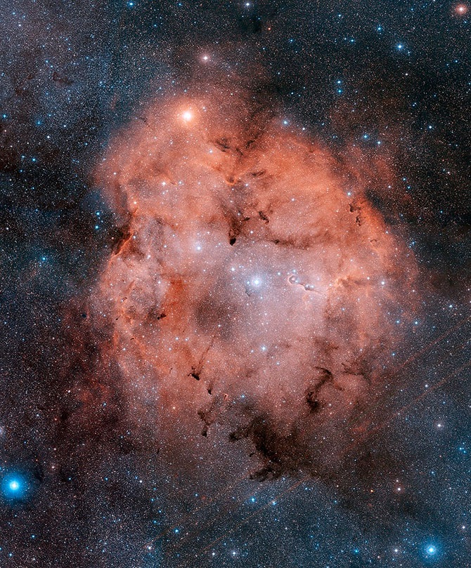 Потрясающая эмиссионная туманность IC 1396, растянувшаяся на сотни световых лет, в которой смешались светящийся космический газ и темные пылевые облака. В центре IC 1396 находится яркая голубая звезда.