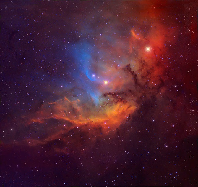 Почему небо вблизи Антареса и Ро Змееносца такое красочное? Эти цвета являются результатом взаимодействия различных объектов и процессов. Красный сверхгигант Антарес — одна из ярчайших звезд на ночном небе — освещает желто-красные облака в нижней центральной части изображения. Ро Змееносца находится в центре голубой туманности.