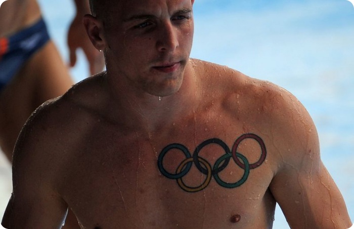 23. Британец Николас Робинсон Бэйкер с татуировкой в виде олимпийских колец на груди выходит из бассейна после синхронного прыжка с 3-хметровой платформы. (Peter Parks/AFP/Getty Images)