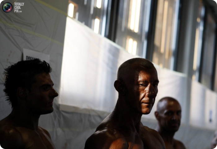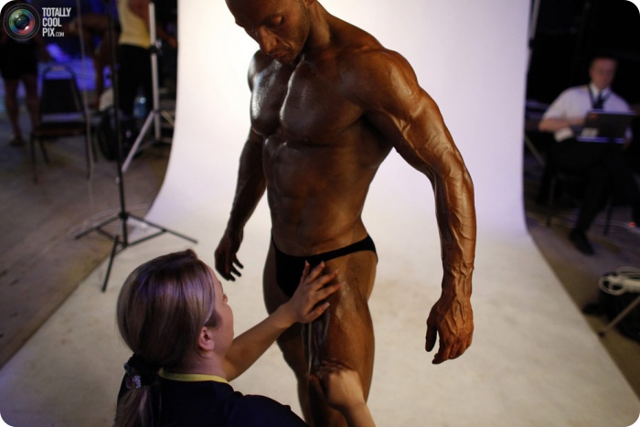 2. Спортсмен готовится к выходу на сцену во время Европейского чемпионата по мужскому бодибилдингу, классическому бодибилдингу и культуризму в Софии 22 мая 2011 года. Чтобы мускулатура лучше смотрелась со сцены, тела участников соревнования покрывают специальным тональным кремом.