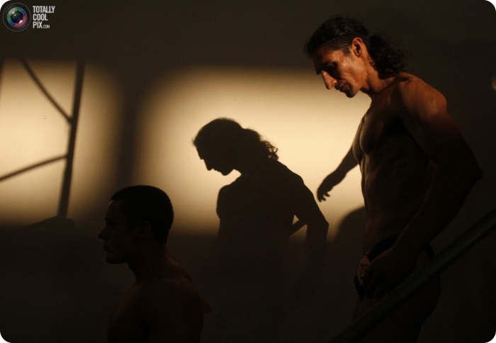 24. За кулисами спортсмены не прекращают разминаться, чтобы при выходе на сцену быть в нужной форме.