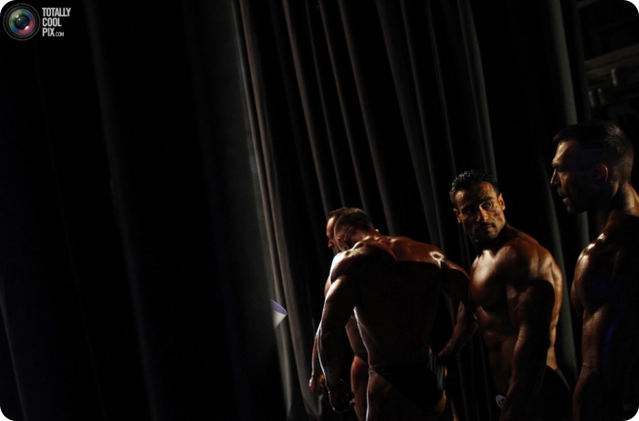 3. Европейский чемпионат по мужскому бодибилдингу, классическому бодибилдингу и культуризму в Софии 22 мая 2011 года. Участники соревнований разминаются за кулисами.