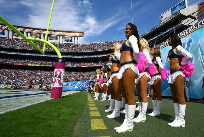 Группа чирлидеров «Charger Girls» выступает во время матча команд «Miami Dolphins» и «San Diego Chargers» на стадионе Qualcomm Stadium 2 октября 2011 года в Сан-Диего, Калифорния.