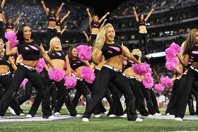 Группа чирлидеров команды «Dallas Cowboys» выступает во время матча своей команды против команды «Detroit Lions» на стадионе Cowboys Stadium в Арлингтоне, Техас, 2 октября 2011 года.