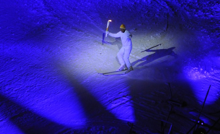 2. Австрийский чемпион Олимпийских игр по скоростному спуску на лыжах 1980 года Леонарж Сток с факелом на открытии зимних Юношеских Олимпийских игр в Инсбруке. (Samuel Kubani/AFP/Getty Images)