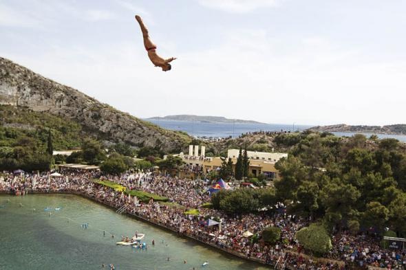 6. Украинец Саша Куценко прыгает с 26,8-метровой платформы на третьем этапе соревнования «Red Bull Cliff Diving» в озеро Вулиагмени в Афинах. (© Samo Vidic / Red Bull Cliff Diving)