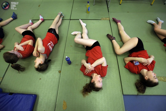 15. Девочки разминаются в спортзале перед прыжками в бассейн. (STEFAN WERMUTH/REUTERS)