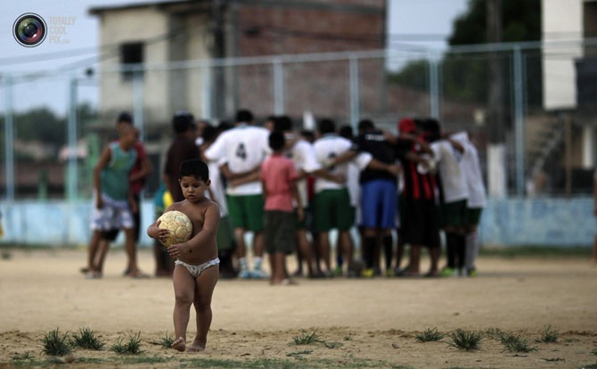 Мальчик держит футбольный мяч, пока игроки «Nova Olinda EC» молятся после матча турнира «Peladao Verde» против команды «Amigos do Kidao» в Манаусе, Бразилия.