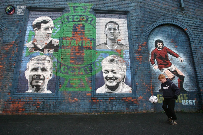 Болельщик «Северной Ирландии» Сэмюэль Стюарт играет возле стены в Белфасте.