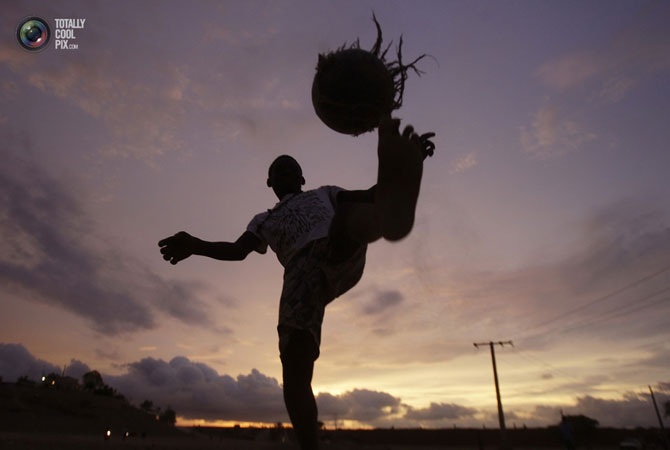 Мальчик играет в футбол на закате в Лобиту недалеко от Бенгелы.