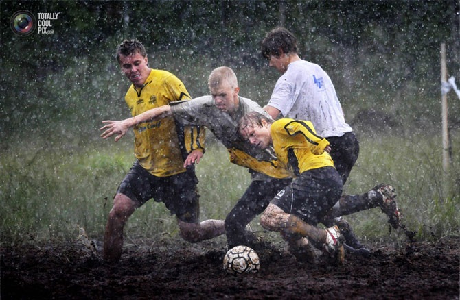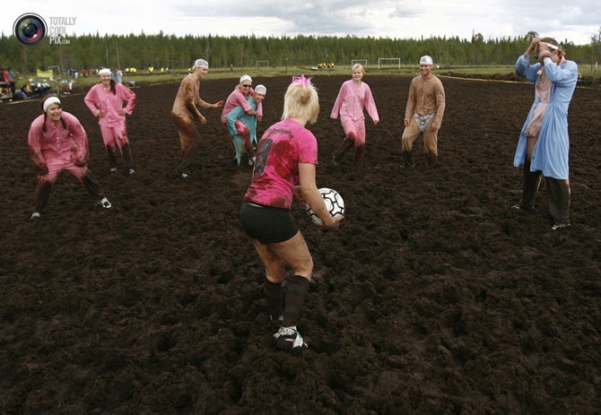 Игроки борются за мяч во время матча чемпионата мира по болотному футболу в Хюрюнсалми, Финляндия.