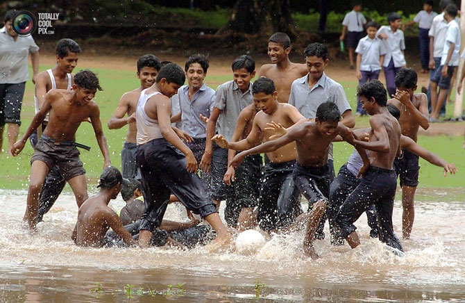 Дети играют в футбол на затопленном поле в Палаккаде, Индия.