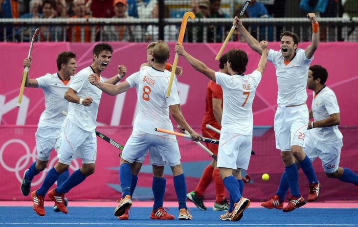 19. Голландские игроки радуются победе над сборной Бельгии в матче по хоккею с мячем. Сборная Нидерландов выиграла со счетом 3-1. (Manan Vatsyayana / AFP — Getty Images)