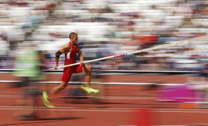 Канадец Damian Warner выступает в прыжках с шестом на соревновании по десятиборью на «Олимпийском стадионе» в Лондоне, 9 августа 2012 года.