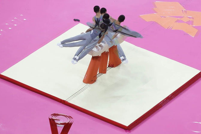 Колумбийский гимнаст Хорхе Уго Хиральдо Лопес выступает на гимнастическом коне во время соревнования по спортивной гимнастике на летних Олимпийских играх в Лондоне 2012 в Лондоне, 28 июля 2012 года.
