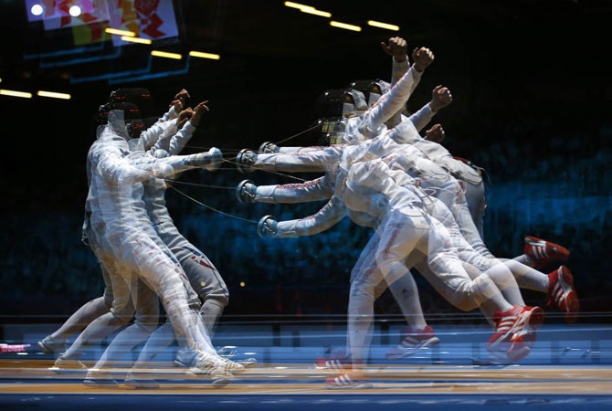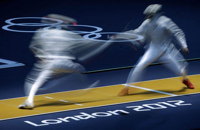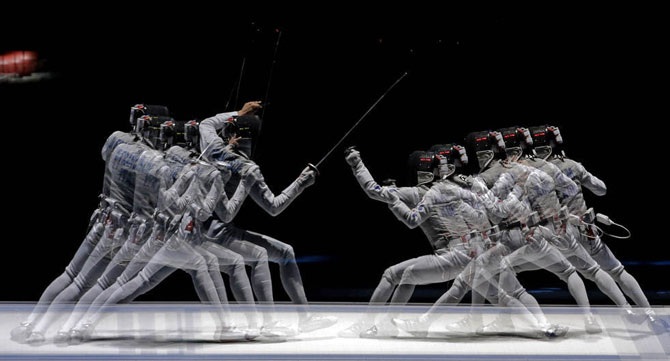 Китаец Man Zhong и Junghwan Kim из Южной Кореи выступают на соревновании по фехтованию саблей на летних Олимпийских играх 2012 в Лондоне, 29 июля 2012 года.