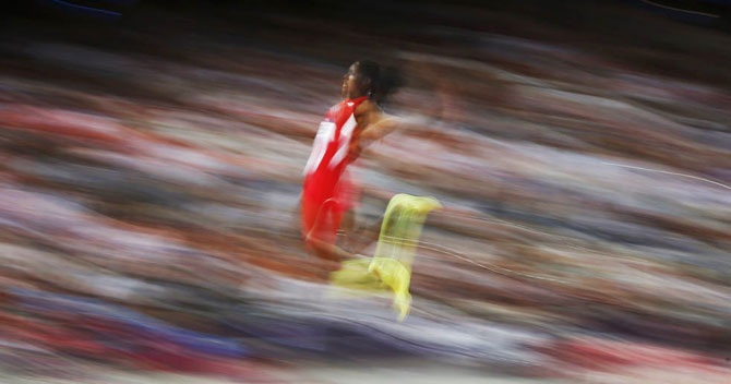 Американка Brittney Reese выступает на соревновании по прыжкам и длину на «Олимпийском стадионе» в Лондоне, 8 августа 2012 года.