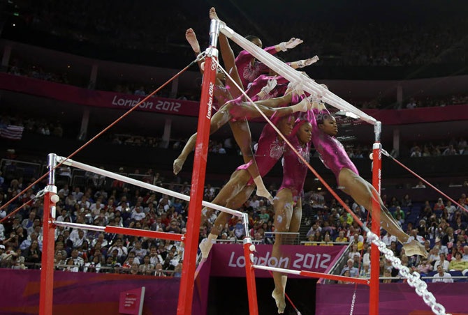 Американская гимнастка Габриэль Дуглас выступает на соревновании по спортивной гимнастике на летних Олимпийских играх 2012 в Лондоне, 2 августа 2012 года.