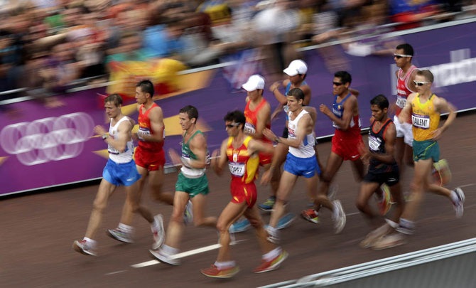 Атлёты участвуют в соревновании по спортивной ходьбе возле Букингемского дворца на летних Олимпийских играх 2012 в Лондоне, 4 августа 2012 года.