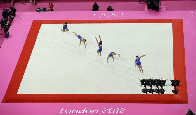 Daniele Matias Hypolito из Бразилии тренируется перед соревнованием на летних Олимпийских играх в Лондоне, 26 июля 2012 года.
