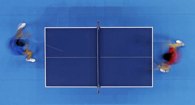 Tianwei Feng из Сингапура (слева) и японка Касуми Ишикава (Kasumi Ishikawa) играют матч по настольному теннису на летних Олимпийских играх в Лондоне, 1 августа.