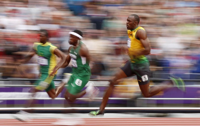 Usain Bolt из Ямайки выступает в забеге на 200 метров на летних Олимпийских играх 2012 в Лондоне, 7 августа 2012 года.