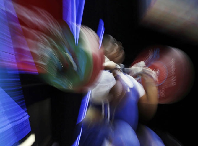 Камерунец Fokejou Tefot выступает на соревновании по тяжелой атлетике в весовой категории свыше 105 килограмм на летних Олимпийских играх в Лондоне, 7 августа 2012 года.
