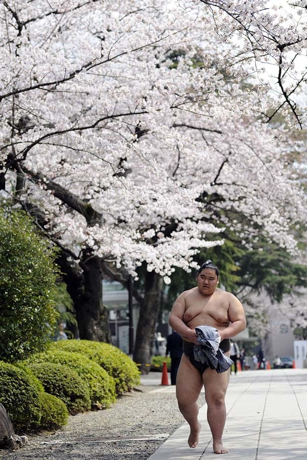 3. Борец сумо идет под цветущей вишней в храм Ясукуни для участия в показательном турнире Хонозумо.