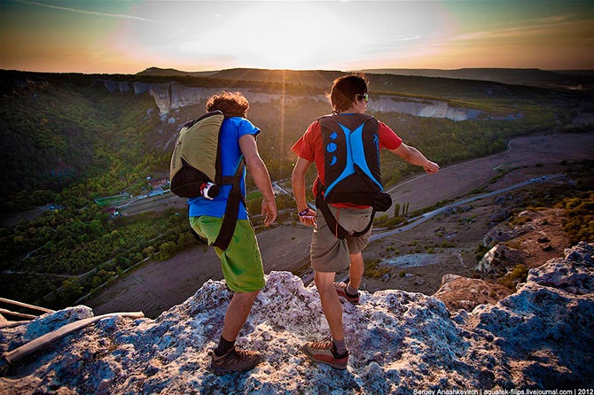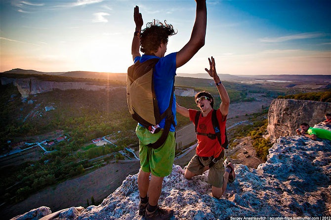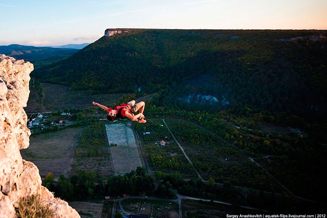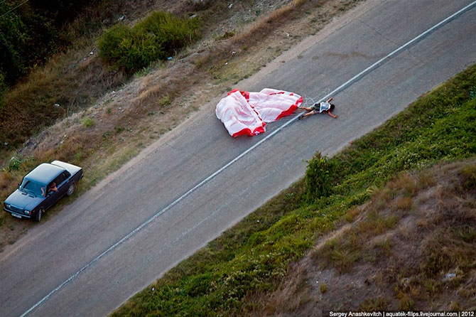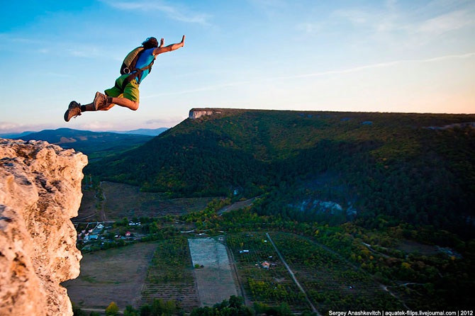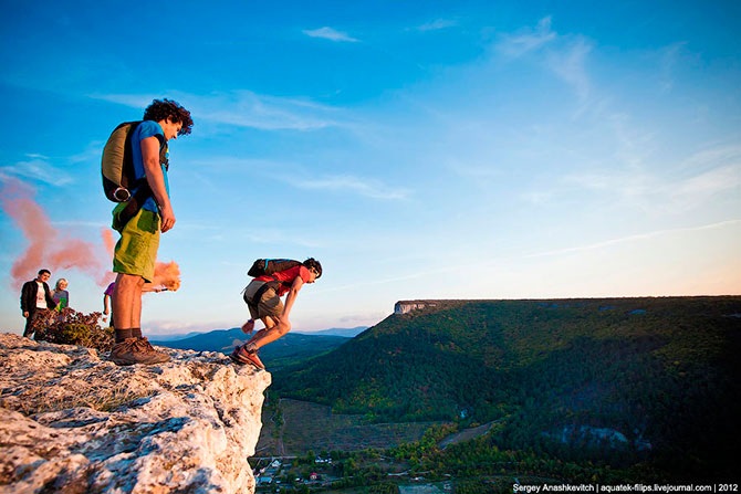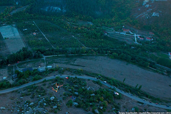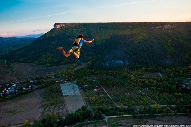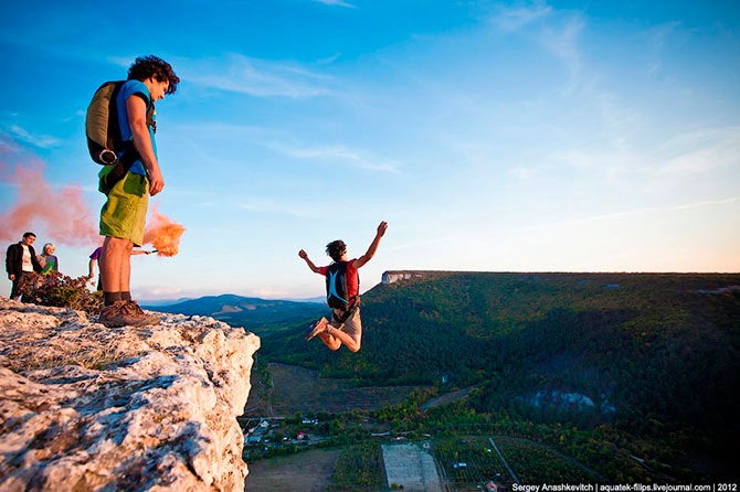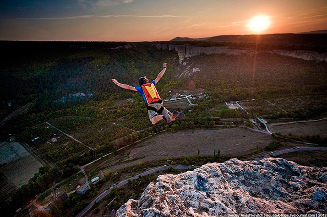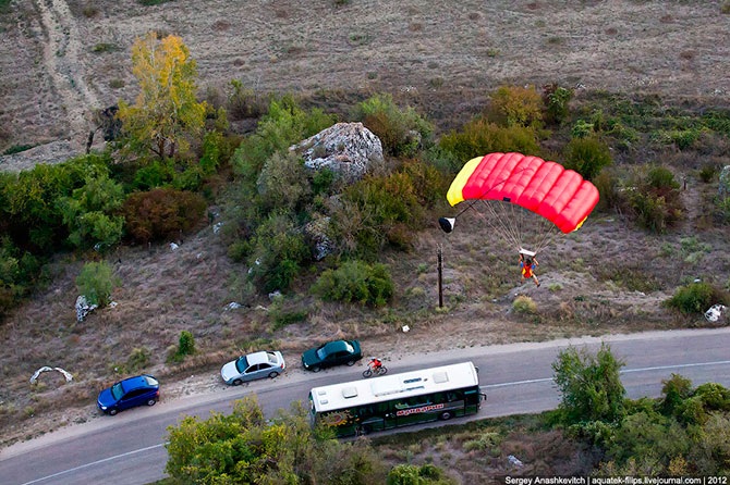 В субботу 6 октября Солнцу, заходящему за горы, довелось увидеть прыжки с парашютом с плато Качи-Кальон (Крым) с высоты всего лишь около 200 метров.