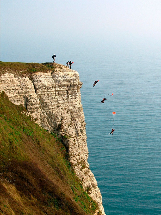 Кстати, интересный факт. Первыми парашютистами были как раз бейсджамперы, если говорить сегодняшним языком. Ведь изобретение и испытания первых парашютов происходили как раз со статичных объектов и с малых высот. Наиболее известными являются прыжки Луи Ленормана с башни обсерватории в Монпелье в 1783 году, Фредерика Родмена Ло с американской Статуи Свободы в 1912 году и другие.