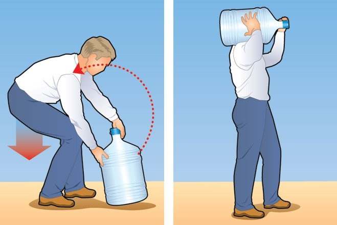 Нести ее по коридору в руке, изгибаясь подобно эргономичной клавиатуре, – удел слабаков. Главным образом потому, что слабаки не догадываются: на плече ее транспортировать легче. Самое сложное – взвалить бутыль на плечо. Для этого нужно присесть поглубже (но так, чтобы колени были не слишком согнуты, иначе на них ляжет дополнительная нагрузка) и, стараясь держать спину прямой, схватить и угнездить на плече бутыль. После этого останется только распрямиться и гордо идти вперед. Кстати, это универсальное правило: если не нагибаться за предметами, а приседать, можно будет поднимать тяжести куда большие, чем ты привык.