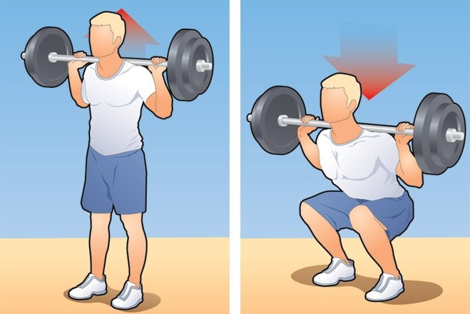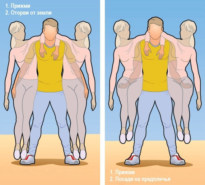 Для более простой позы (левая картинка – так называемая «пирамида слабака и неудачника») нужны лишь крепкие бедра и бицепсы. «Можно считать, что ты готов к этому трюку, – говорит наш эксперт, – если можешь присесть 8 раз со штангой весом 65–80% массы твоего тела и выжать 20% при сгибании рук на бицепс». Если хочешь именно подхватить женщин на руки, тебе понадобятся еще крепкая спина и пресс. К счастью, базовыми упражнениями и в этом случае будут приседания и сгибания. 110–120% твоего веса и до 50% соответственно.Укради где-нибудь штангу, взвали на лопатки и, стараясь держать спину прямой, садись, пока бедра не станут параллельны полу. Представь, что садишься на самый краешек стоящей сзади табуретки.
