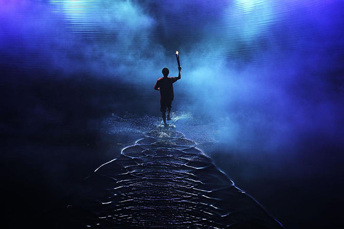 Даррен Чой из Сингапура несет факел Юношеских Олимпийских Игр во время церемонии открытия, Сингапур, 14 августа 2010. Фотограф Adam Pretty.