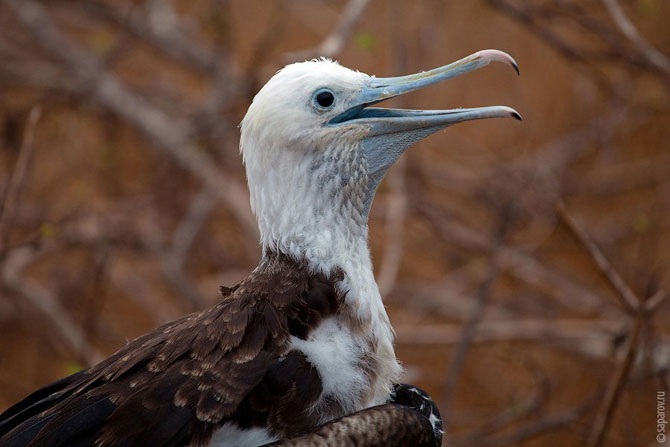 Это, собственно, самка, ради которой тужатся самцы. Интересно, что период высиживания птенцов у фрегатов длится около года! В условиях отсутствия хищников, такой долгий период высиживания необходим для естественного регулирования численности популяции.