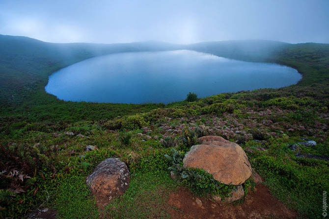 Чтобы добраться до вулкана, нужно пройти несложный трек — примерно 2 часа в одну сторону. Вершина кратера вулкана почти всегда в тумане. Подобная ситуация повторялась на всех островах — вулканы собирают вокруг себя тучи, хотя чуть ниже вовсю светит солнце. Около получаса мы шли в плотном тумане по чавкающей жиже среди густого кустарника.