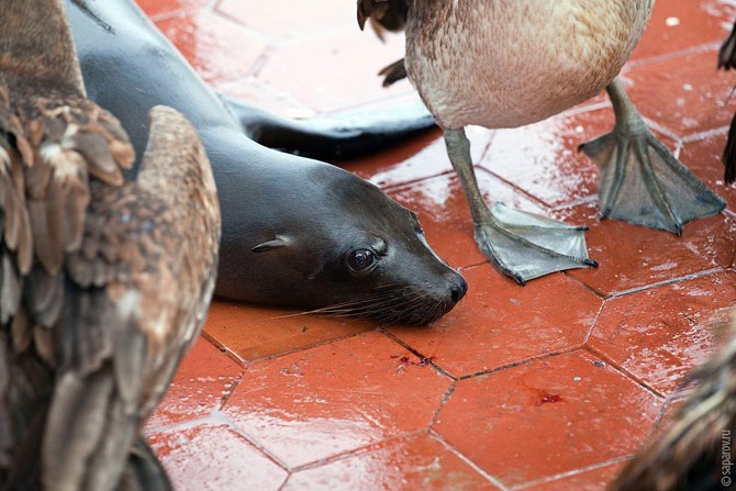 Вообще, чтобы увидеть морских львов, совсем не обязательно ходить далеко. Целый день в порту ошивается целая толпа этих морских животных, греясь на солнце и мешая туристам выходить на берег. Туристы их боязливо обходят стороной, девушки взвизгивают при каждом резком движении животного, а местные с ними особо не церемонятся — дети кидают в львов камнями.