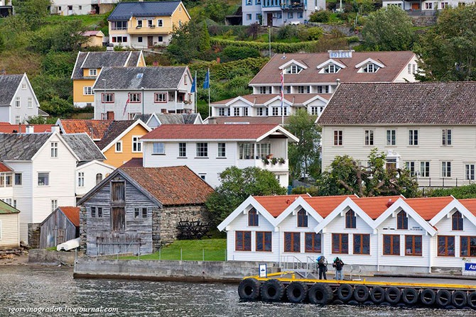 Отправляюсь прокатится на кораблике по живописному норвежскому фьорду, правда, погода немного мрачноватая, время от времени облака медленно проплывая открывают солнышко и снова закрывают, но светило пытается пробиваться сквозь угрюмые тучи.