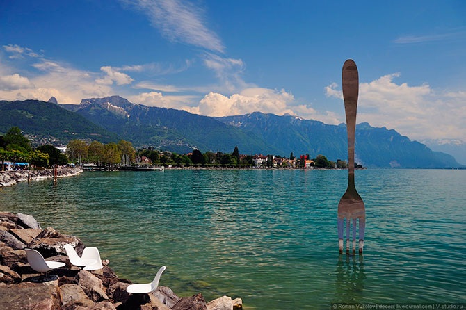 Окрестности соседнего города Веве. Вилку в дно Женевского озера напротив городского Музея питания «Алиментарий» воткнули художники Жан-Пьер Цауг и Жорж Фавре. Случилось это в 1995 году по случаю двухлетия музея. Правда, через год городская администрация потребовала ее убрать. Вилка вернулась на место в 2007 году вместе с одной из выставок, и тогда ее разрешили оставить здесь навсегда.