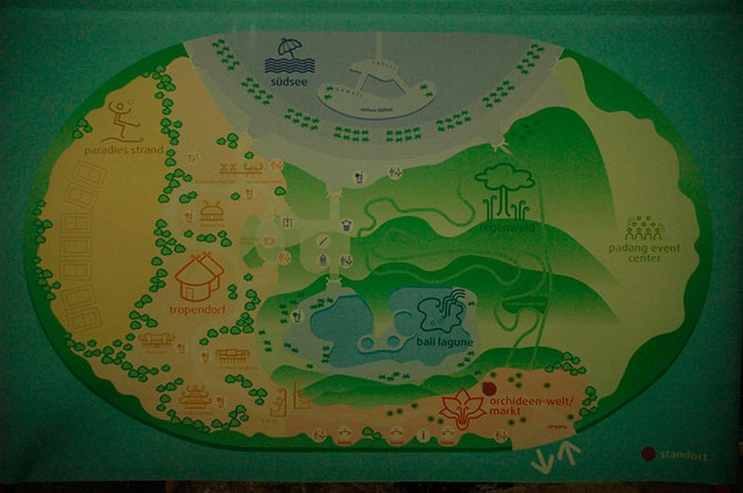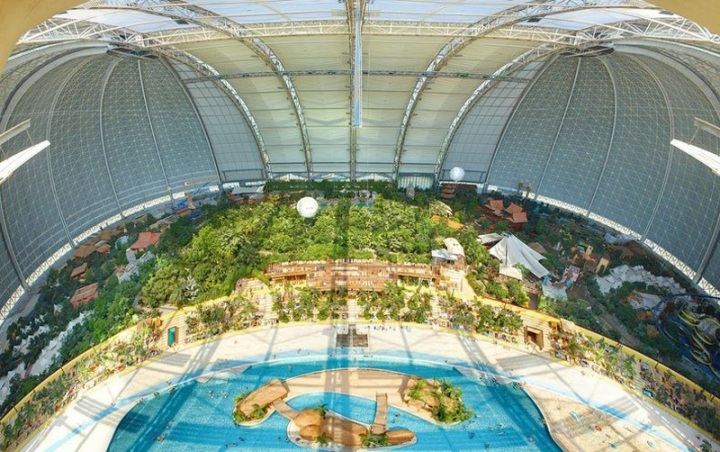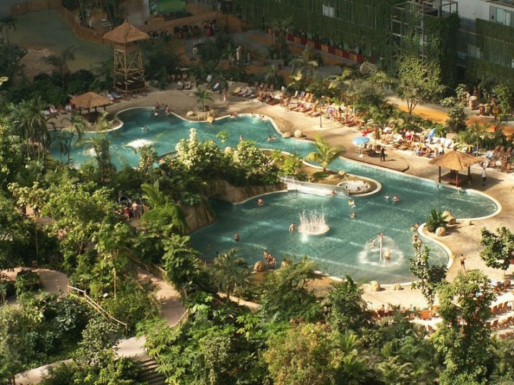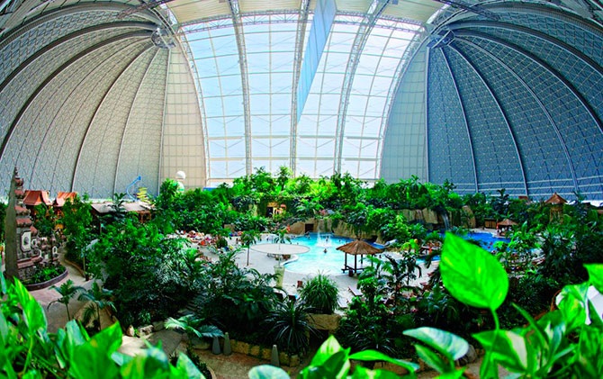Размеры этого гигантского аквапарка действительно потрясают – 360 метров в длину, 210 в ширину и 108 метров в высоту. Общая площадь – 66 тысяч квадратных метров. Такая площадь примерно равна площадям восьми футбольных полей, а высота позволяет спрятать внутри статую Свободы (вертикально) и Эйфелеву башню (горизонтально). Примерная вместительность искусственного курорта – 7 тысяч туристов одновременно. Оригинальное название сооружения – «Tropical Islands Resort». Температура воздуха здесь стабильно +25 градусов по Цельсию, а воды – +28.