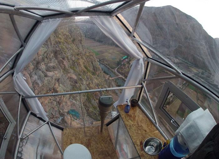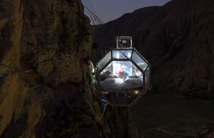 Внутри капсулы находится кровать, лампа и санузел. Наверху расположена небольшая терраса для завтраков на открытом воздухе. Отель очень популярен среди скалолазов-любителей и влюбленных пар.