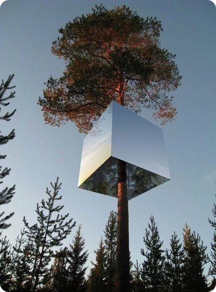 построен в сосновом лесу в 60 км за Полярным кругом. Он состоит из 4 сооружений: Cabin, Blue Cone, Nest и Mirrorcube. В планах компании Treehotel построить еще две дополнительные структуры. В таком необычном отеле уже изъявили желание отдохнуть несколько человек, в основном, из Европы, однако есть желающие и из Австралии и Новой Зеландии. Не совсем комфортные для обывателя условия владельцев отеля не смущают. Стоимость номера для одного человека составит 290 евро, для двух гостей в Mirrorcube – 420 евро.